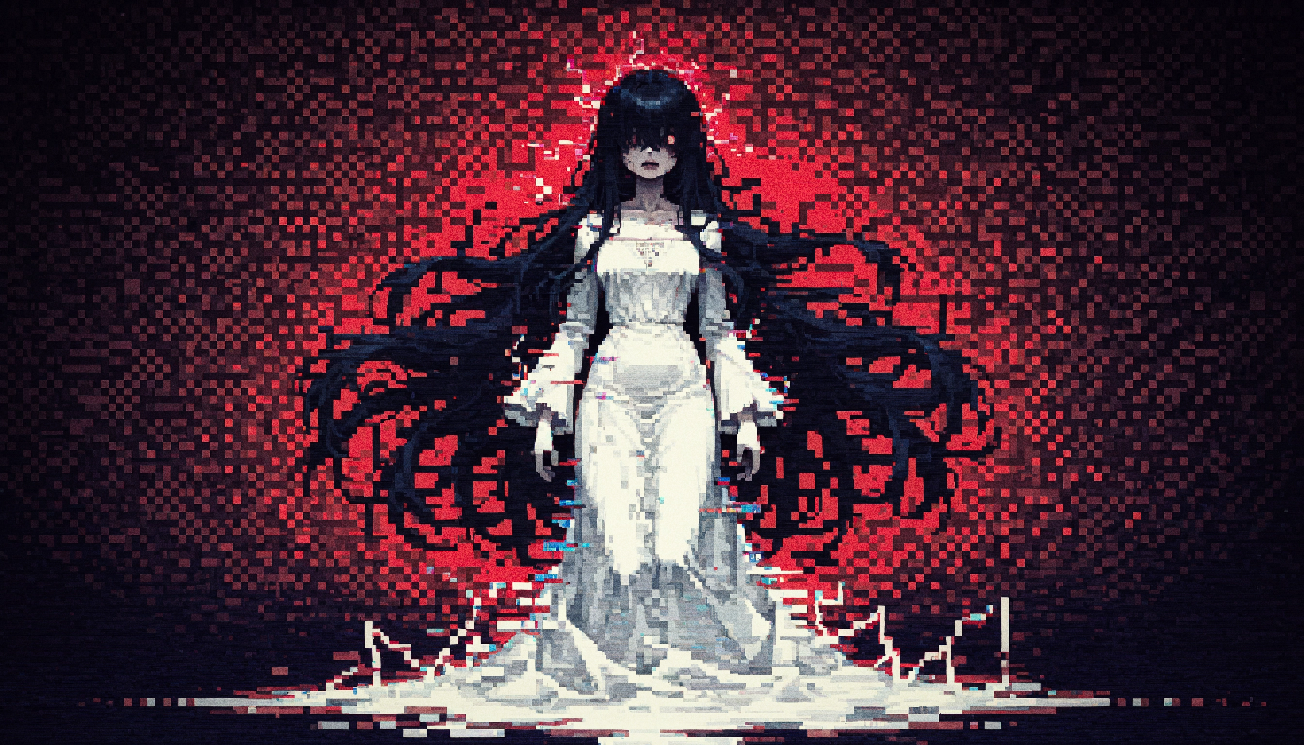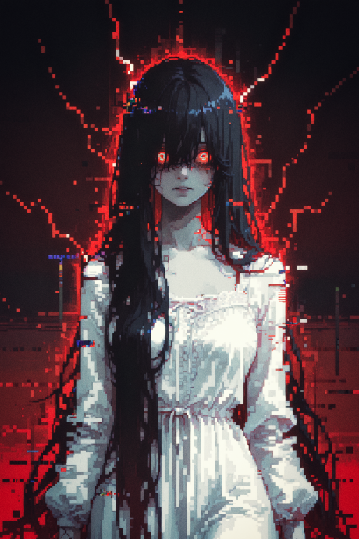 The core inspiration is obviously the classic vengeful spirits from Japanese horror. You know, that “girl with long black hair” archetype, completely pissed about the tragedy and cruelty inflicted on her. The illegal experiments killed her body but her rage got caught in the code and now she’s EVERYWHERE the technology reaches. Every camera watching. Every speaker waiting to scream. The building is her nervous system and she’s taught it to hunt. She forces victims through “trials” that mirror the torture she endured, because why should she be the only one who suffered, right?